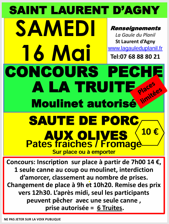 Le samedi 16 MAI l'équipe de la Gaule du Planil organise un concours de pêche à la truite.